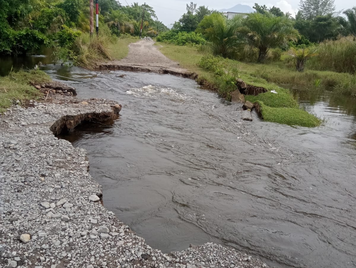 PASAMAN BARAT, Jalan lingkar poros yang penghubung Jorong Pondok Nagari Sasak dengan Kecamatan Luhak Nan Duo, Kabupaten Pasaman Barat (Pasbar) rusak parah akibat luapan Sungai Batang Ampu dan sungai Batang Kapa.